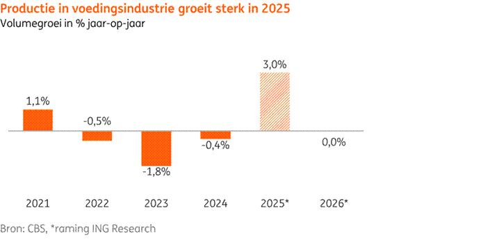 De vraag naar voedingsmiddelen en vooral van duurdere producten trekt aan in 2025 dankzij de verbeterde koopkracht in Nederland en Europese afzetmarkten. De groei is opmerkelijk omdat er tegelijkertijd druk is op productievolumes bij vlees- en zuivelbedrijven.